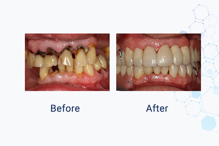 Medication induced decay and tooth loss restored with composite crowns and metal substructure dentures.