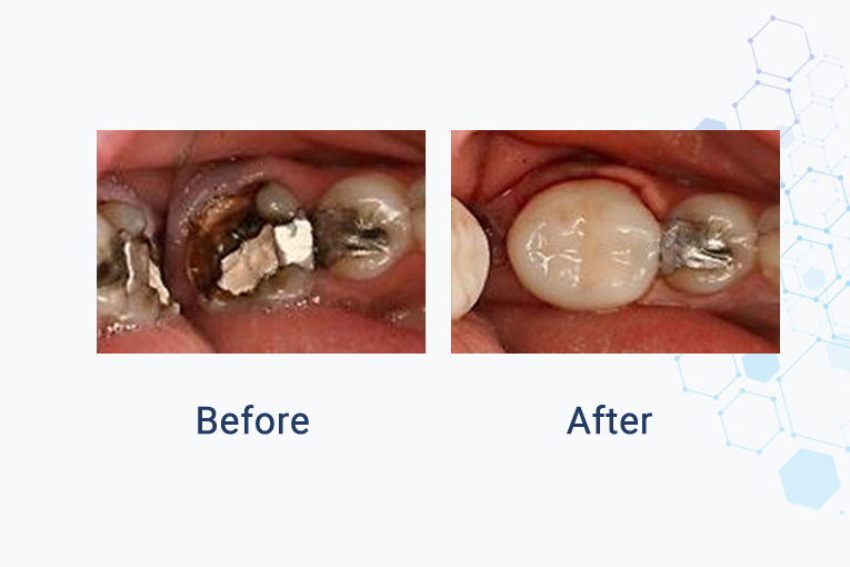 A composite crown is used to restore a heavily filled and broken-down molar.